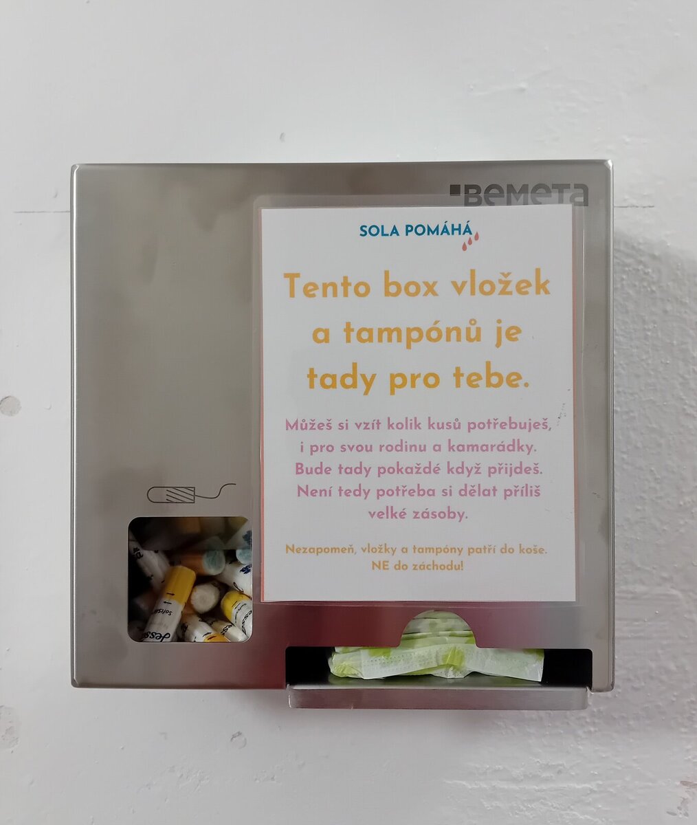 Děkujeme organizaci Sola pomáhá za boxy na menstruační pomůcky a za velikou zásobu tampónů a vložek pro klientky z našich azylových domů.